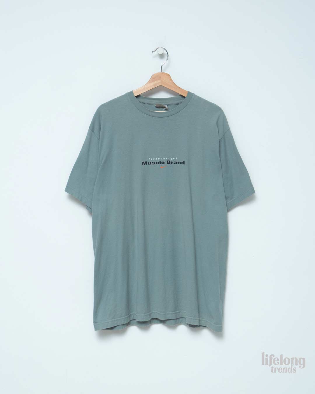 Camiseta Nike vintage en color azul grisaceo, con el logo estampado en el pecho.